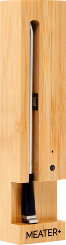 De Meater Plus is een geavanceerde draadloze vleesthermometer die is ontworpen om nauwkeurigheid en gemak te bieden tijdens het koken. De Meater Plus wordt geleverd met een draadloze sonde die je in het vlees steekt en verbindt met de Meater-app op je smartphone via Bluetooth of wifi. Met real-time monitoring van de kerntemperatuur en aangepaste meldingen, helpt de Meater Plus je om gerechten perfect te bereiden. Het compacte ontwerp en de oplaadbare batterij maken het apparaat handig en draagbaar. Dankzij zijn gebruiksvriendelijkheid en geavanceerde functies is de Meater Plus een handige metgezel voor zowel beginnende als ervaren koks.