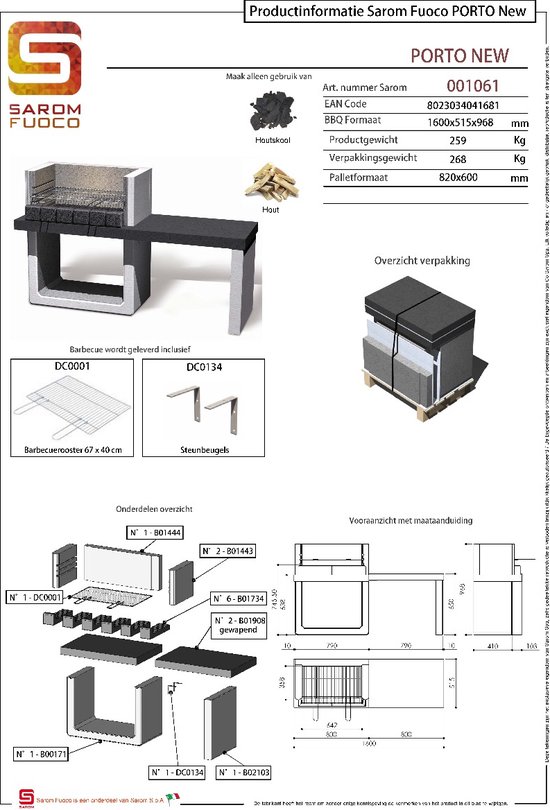 Specificaties: Sarom Fuoco – Betonnen barbecue – Porto NEW – 160 x 51,5 x 96,8 cm